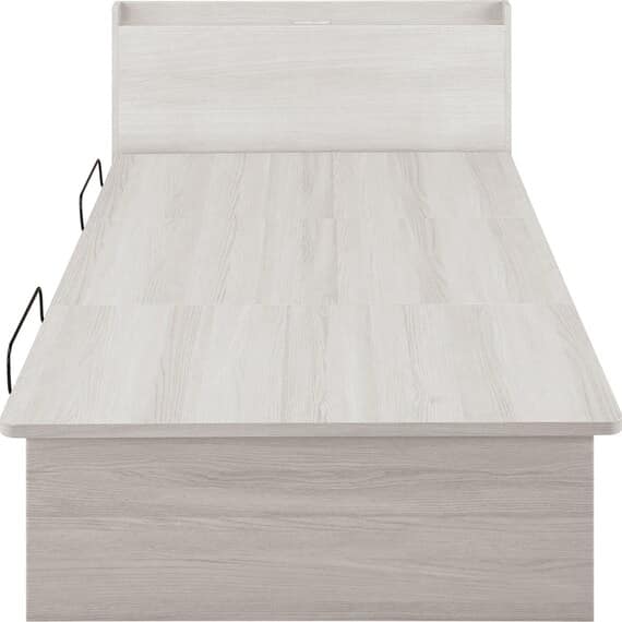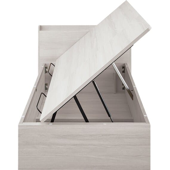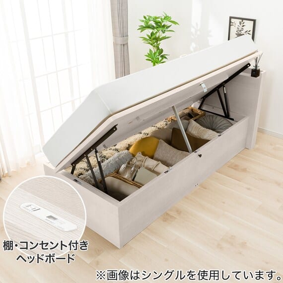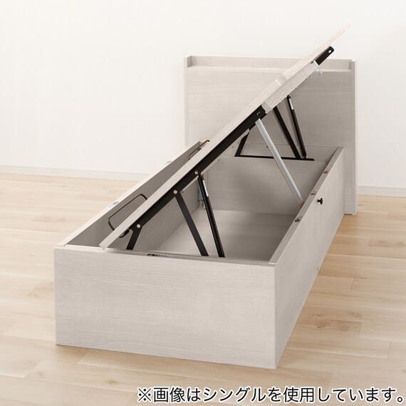 【N-ジオ】シリーズは、横開きと縦開きのタイプがあり、引出しに入らない大きなサイズの物も収納できるうえ、中身を一度に見渡せる大容量収納が魅力です。さらに、ヘッドボードを選べるため、お部屋の雰囲気やライフスタイルに合わせて自分好みのデザインを選びたい方におすすめです。シリンダーで跳ね上げをサポート。マットレスを載せたままラクラク開閉が可能です。