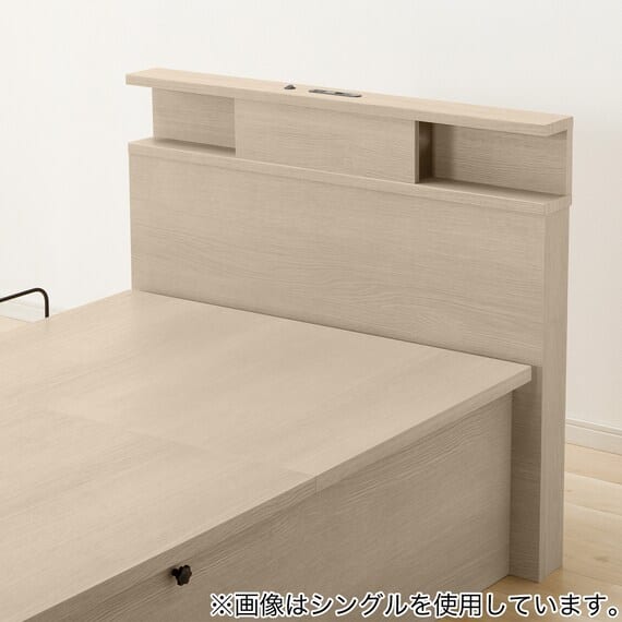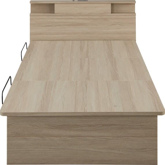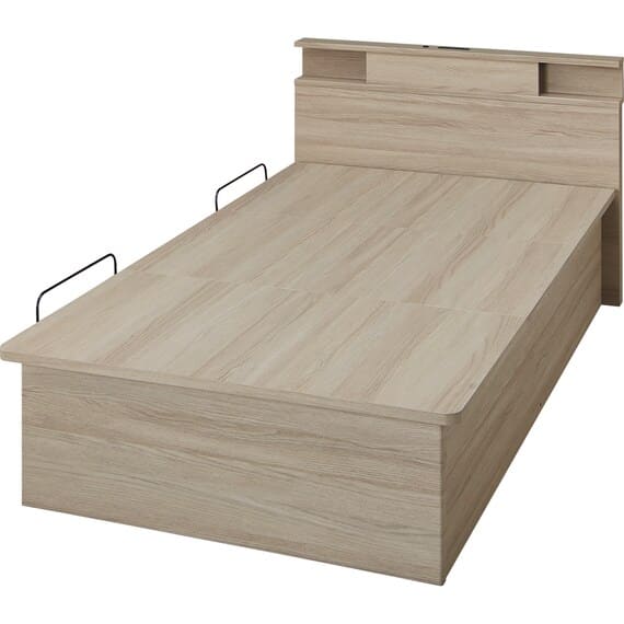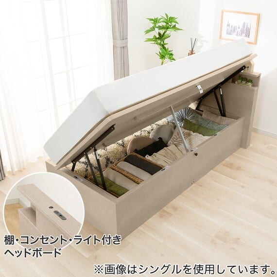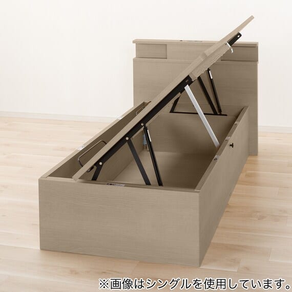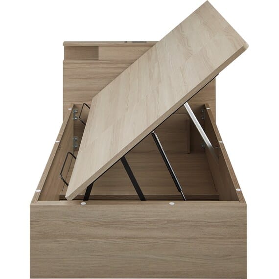 【N-ジオ】シリーズは、横開きと縦開きのタイプがあり、引出しに入らない大きなサイズの物も収納できるうえ、中身を一度に見渡せる大容量収納が魅力です。さらに、ヘッドボードを選べるため、お部屋の雰囲気やライフスタイルに合わせて自分好みのデザインを選びたい方におすすめです。シリンダーで跳ね上げをサポート。マットレスを載せたままラクラク開閉が可能です。