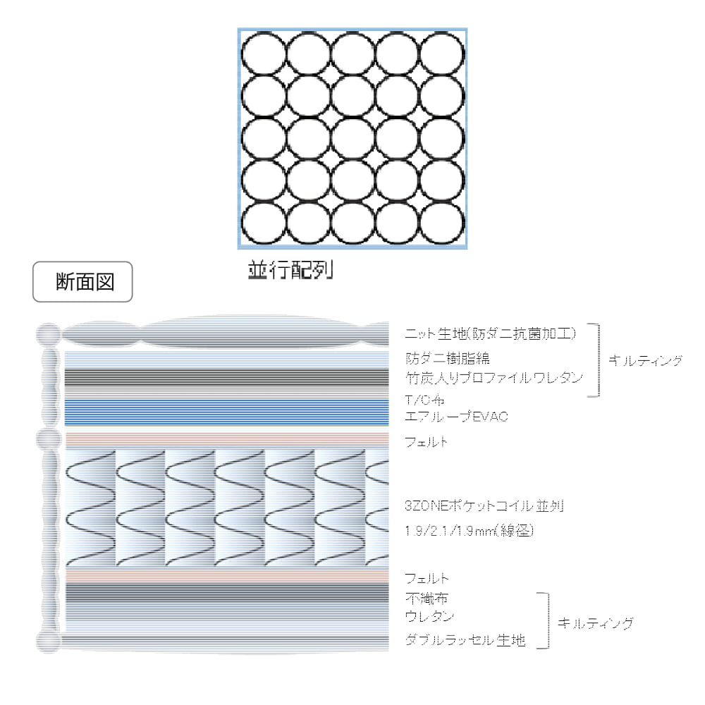 | 材質: | ポケットコイル・エチレン樹脂網状立体構造 |