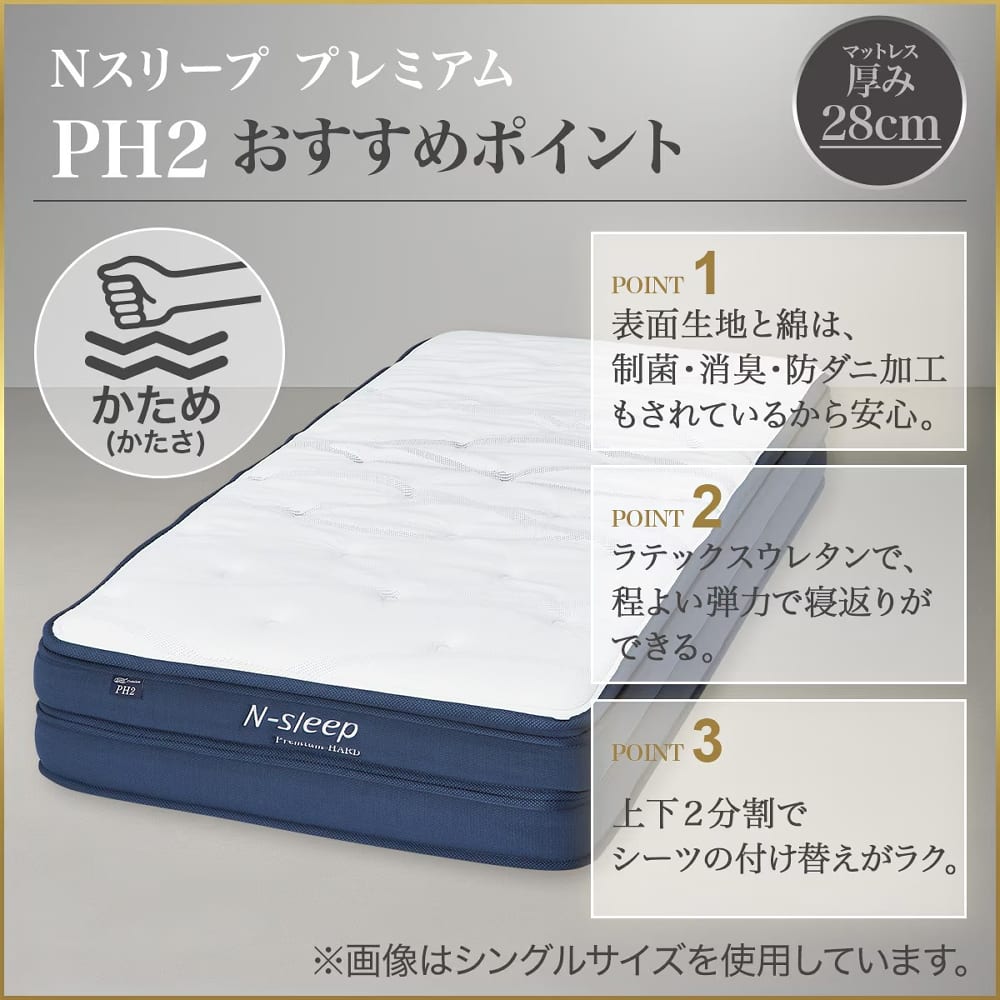 ◆N-sleepプレミアムハード PH2は、2層のポケットコイルとラテックスの組み合わせにより、ほどよい弾力と寝返りのしやすさを実現した快適な寝心地です。◆伸縮性の高いニット生地を採用し、制菌・防ダニ加工(屋内塵性ダニ類対象)が施されているため、清潔で快適にお使いいただけます。