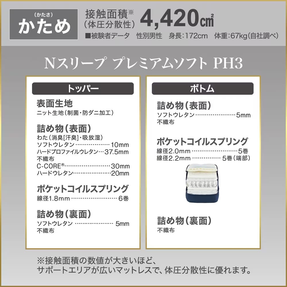 ◆N-sleepプレミアムハード PH3は、2層のポケットコイル、「C-CORE」、かための波型ウレタンによって、ワンランク上の寝心地を実現します。◆表面には伸縮性の高いニット生地を使用し、制菌・防ダニ加工(屋内塵性ダニ類対象)が施されているので、清潔で快適にお使いいただけます。