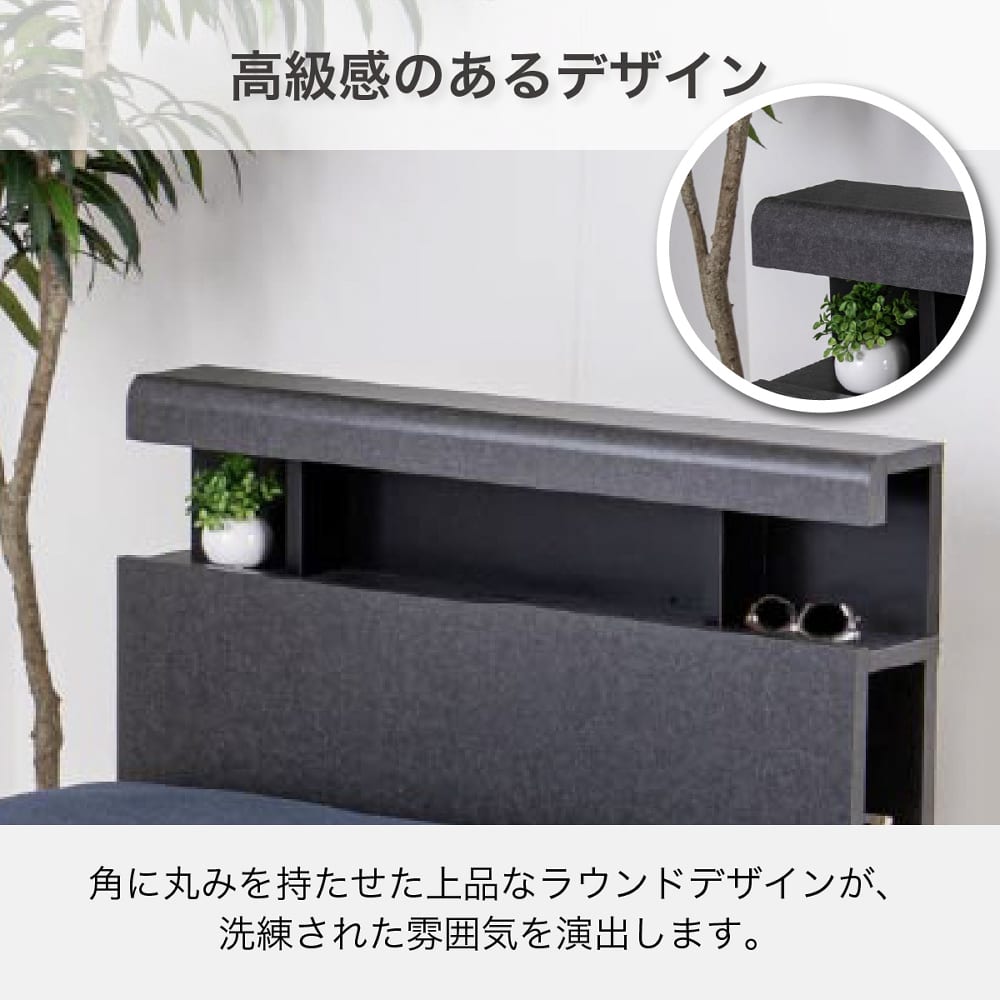 ◆上品なヘッドボードデザインが特徴。◆ヘッドボードの両脇には、本やタブレットを収納できるスペースが完備。