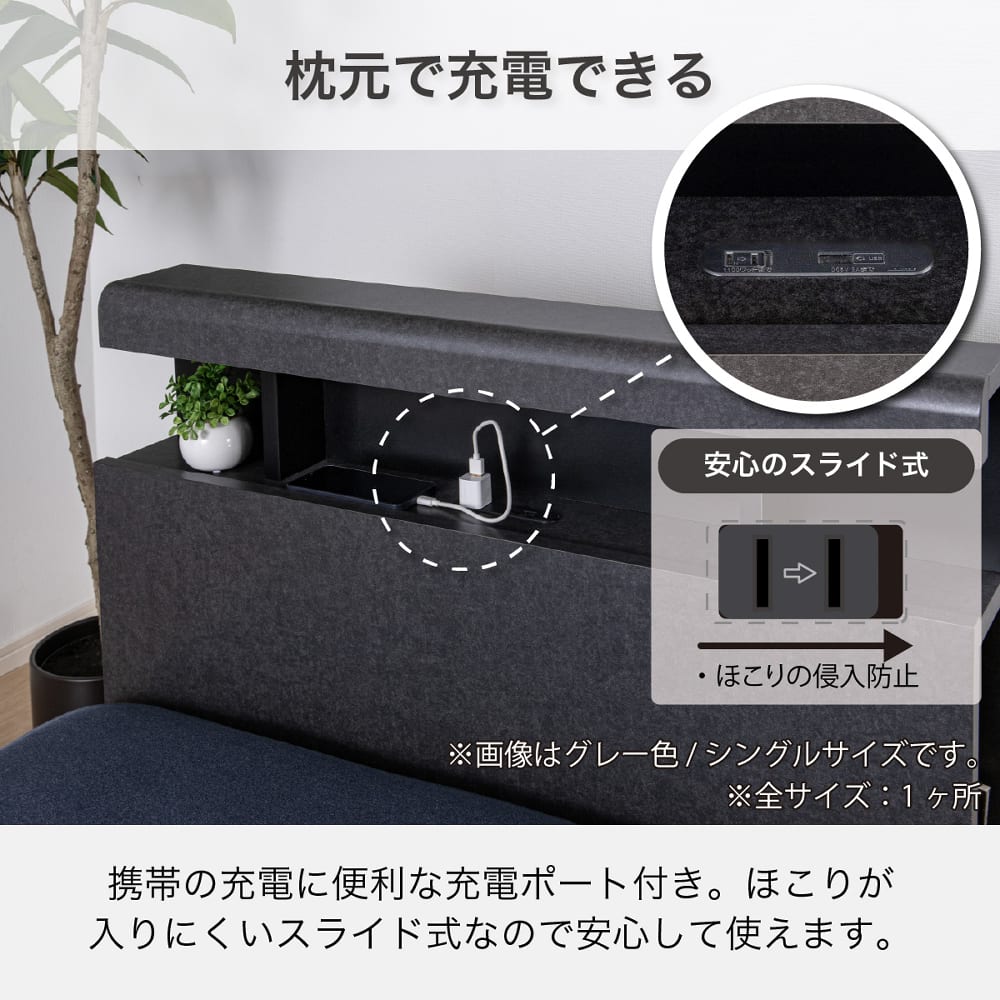 ◆上品なヘッドボードデザインが特徴。◆ヘッドボードの両脇には、本やタブレットを収納できるスペースが完備。