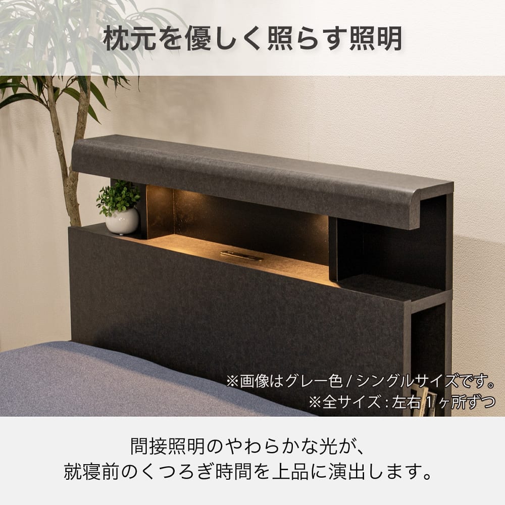 ◆上品なヘッドボードデザインが特徴。◆ヘッドボードの両脇には、本やタブレットを収納できるスペースが完備。
