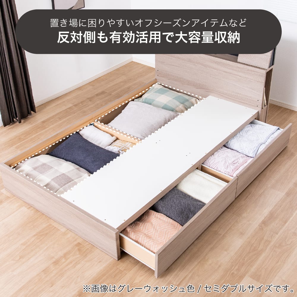 ◆上品でモダンな印象のスロープ型デザインのヘッドボードが特徴。◆ヘッドボードの両脇には、本やタブレットを収納できるスペースが完備。
