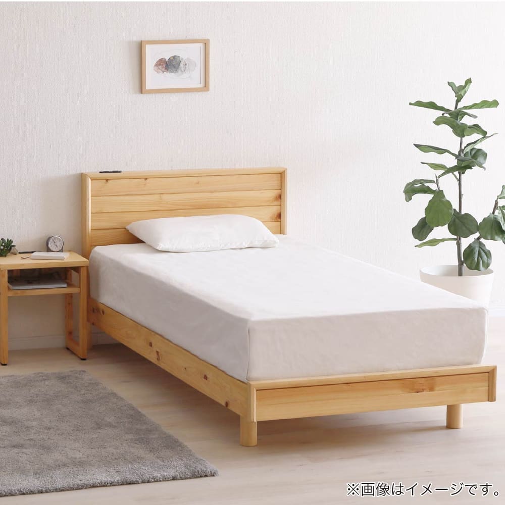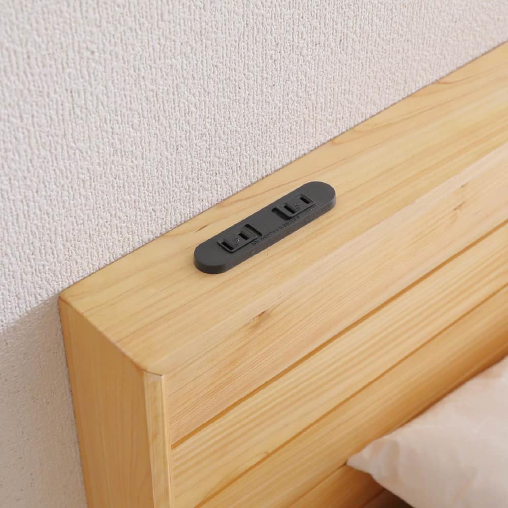◆檜無垢材を使用したシンプルなベッドフレームです。檜の香りがリラックス効果をもたらしてくれます。◆ヘッドボードはスマホの充電に便利な2口コンセント付き。壁にピッタリ巾木除け仕様です。