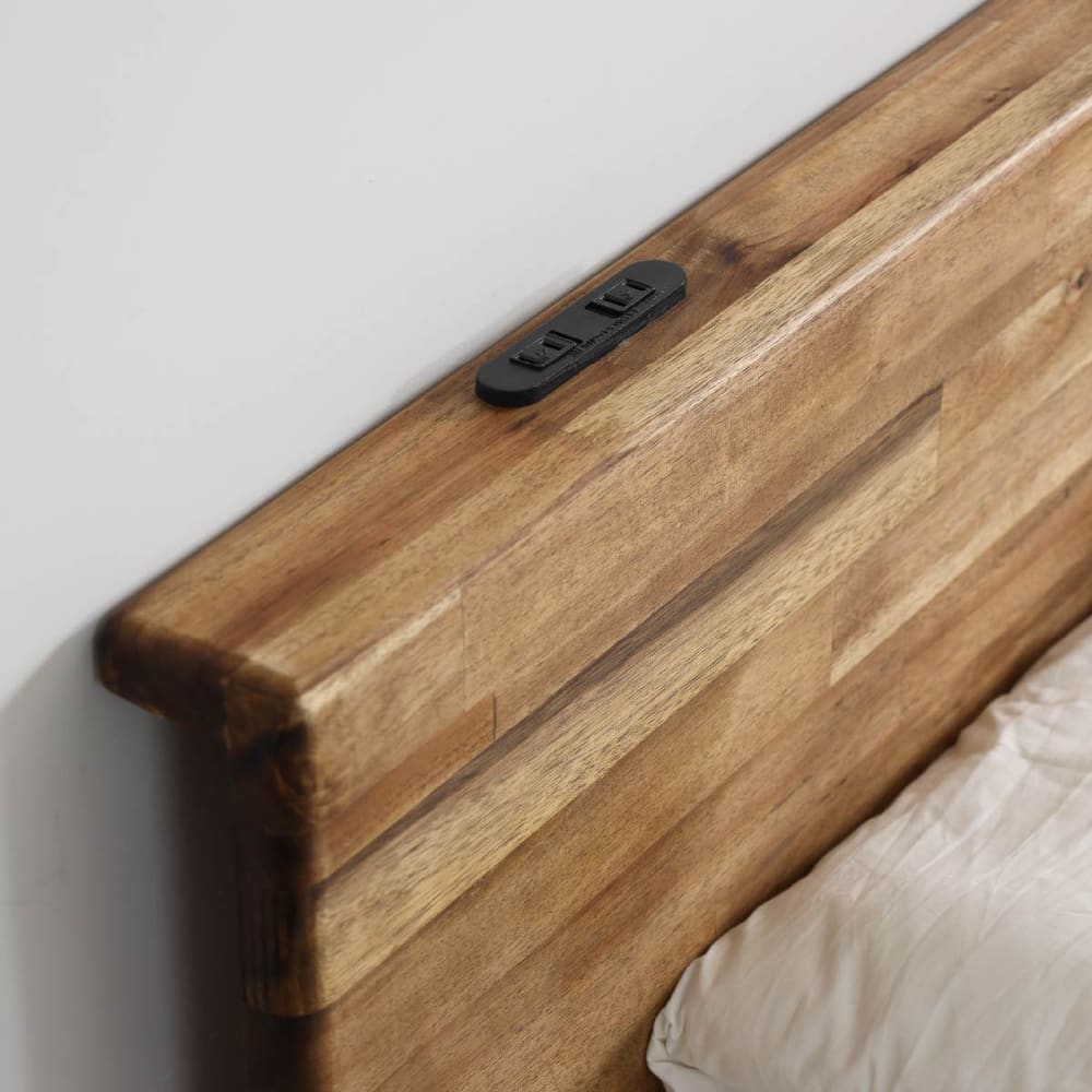 ◆アカシア無垢材を使用したシンプルなベッドフレームです。◆ヘッドボードはスマホの充電に便利な2口コンセント付き。壁にピッタリ巾木除け仕様です。