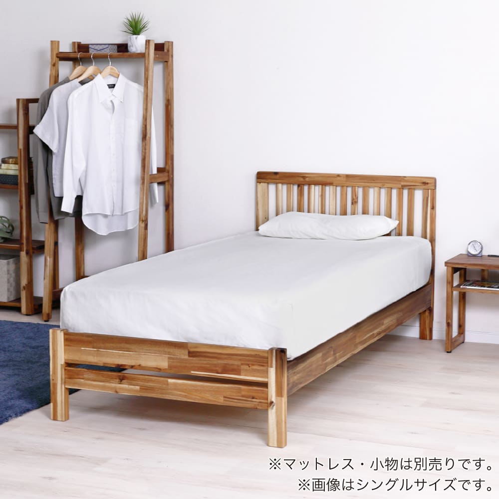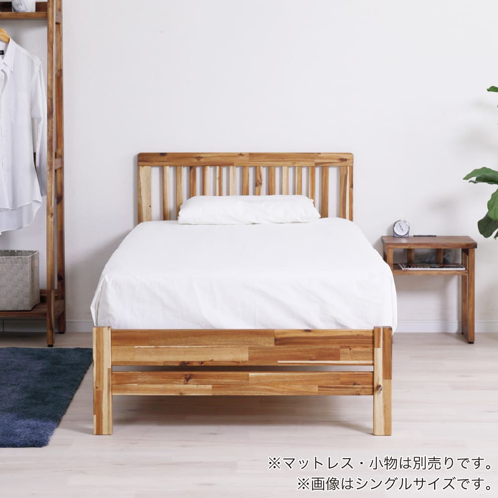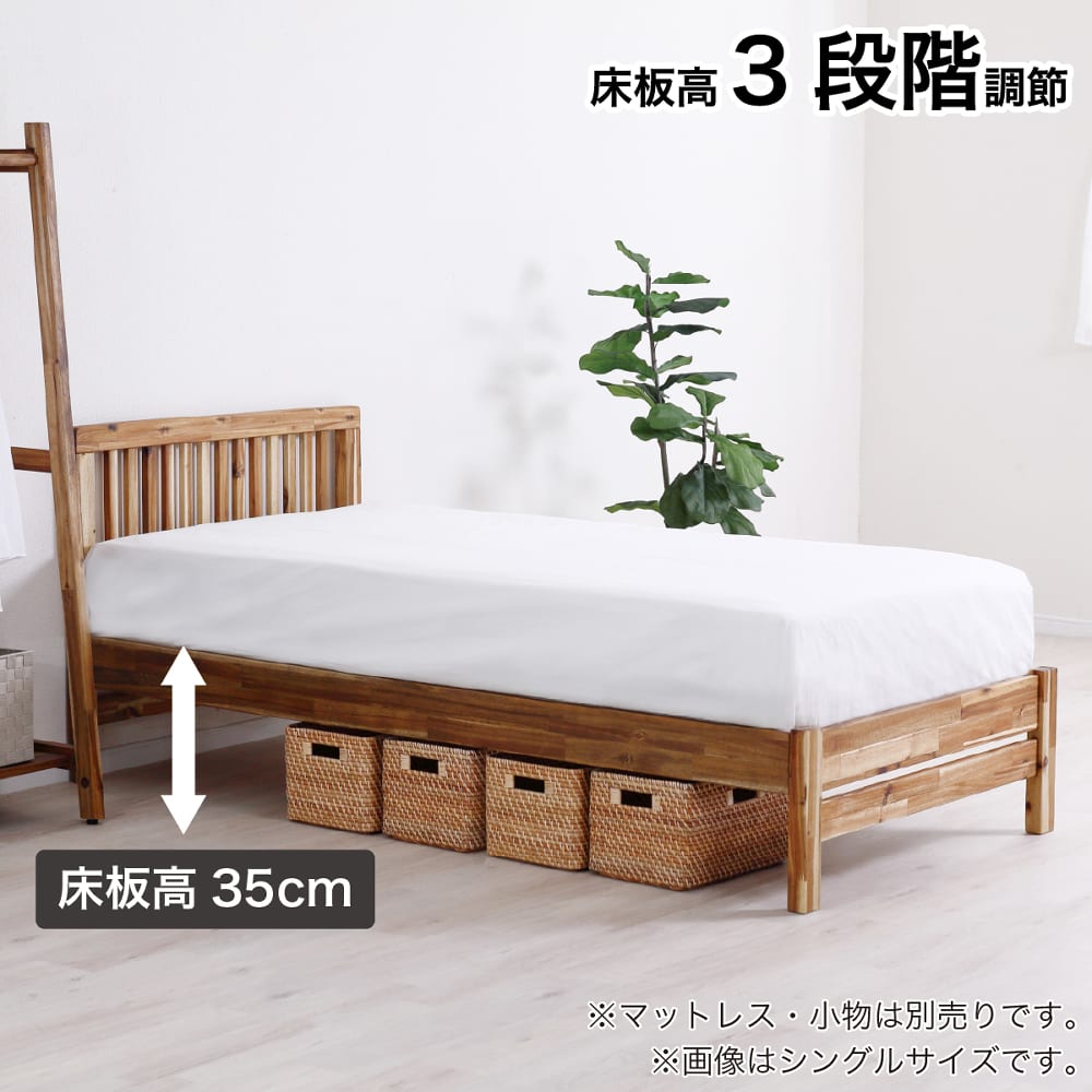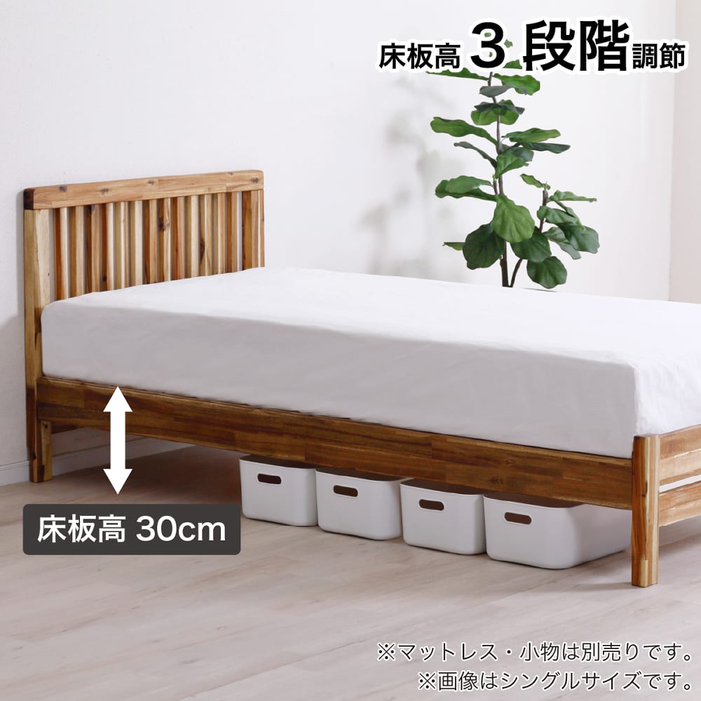 ◆アカシア無垢材を使用したシンプルなベッドフレームです。◆3段階でサイドフレームの高さを調節出来ます。足元は巾木よけ仕様になっています。