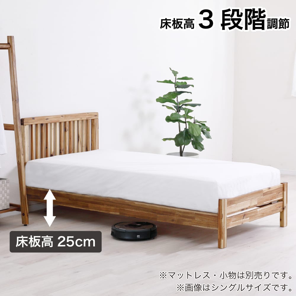 ◆アカシア無垢材を使用したシンプルなベッドフレームです。◆3段階でサイドフレームの高さを調節出来ます。足元は巾木よけ仕様になっています。