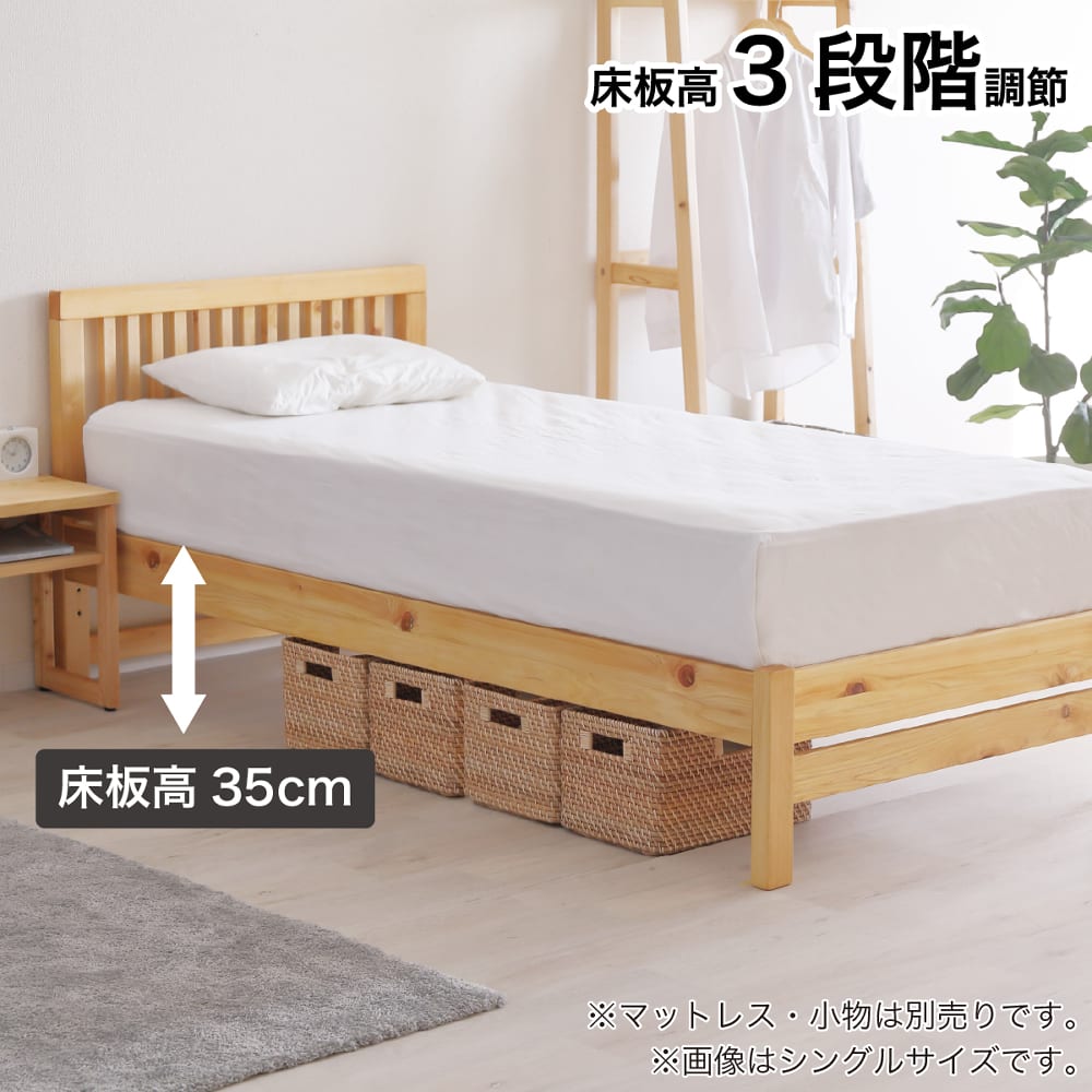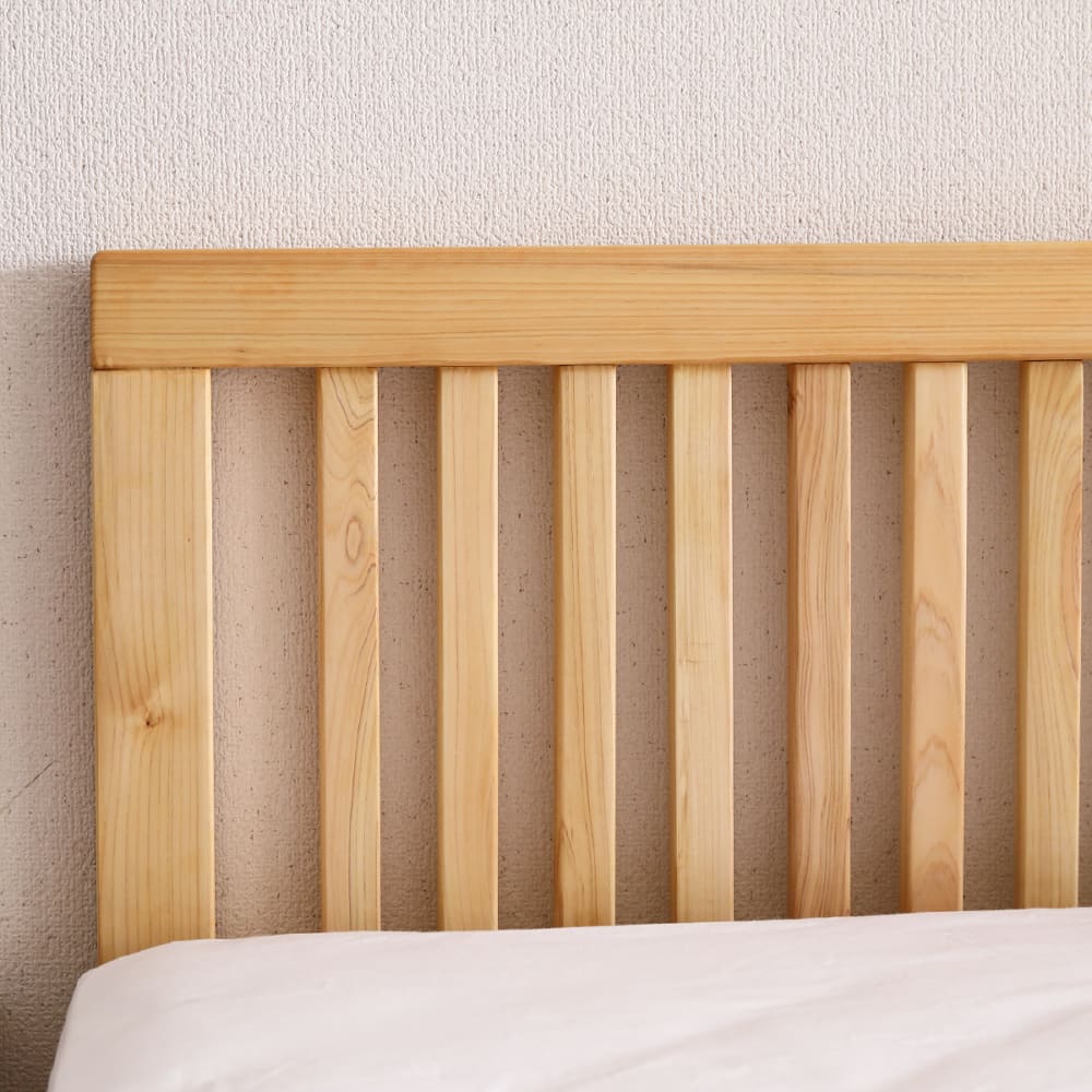 ◆檜無垢材を使用したシンプルなベッドフレームです。檜の香りがリラックス効果をもたらしてくれます。◆3段階でサイドフレームの高さを調節出来ます。足元は巾木よけ仕様になっています。