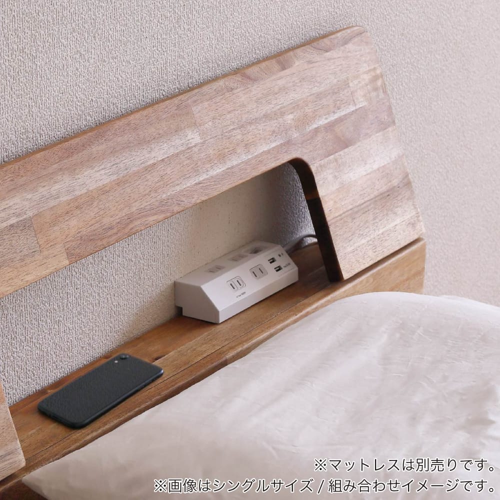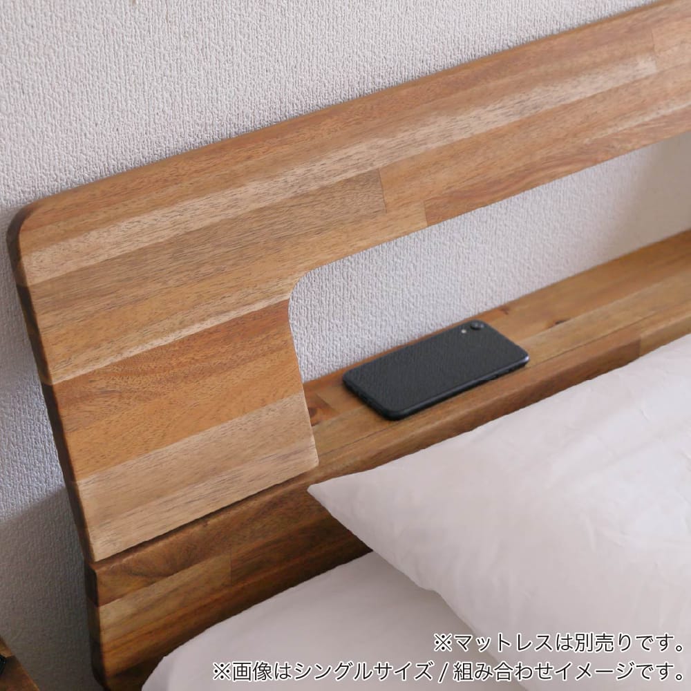 ◆アカシア無垢材を使用したランダムな濃淡を生かしたベッドフレームです。◆ヘッドボードは棚付きになっており小物を置く事が可能。またヘッド部が巾木除けにもなっております。