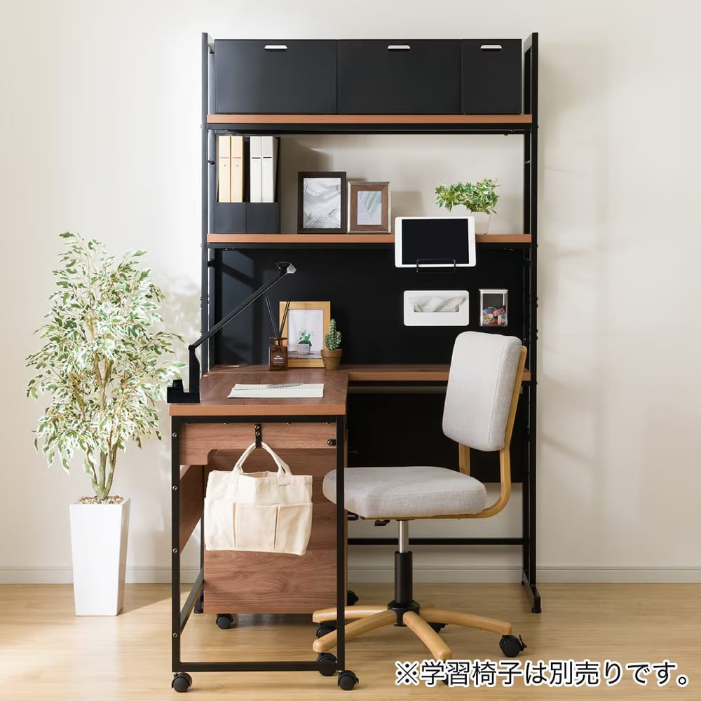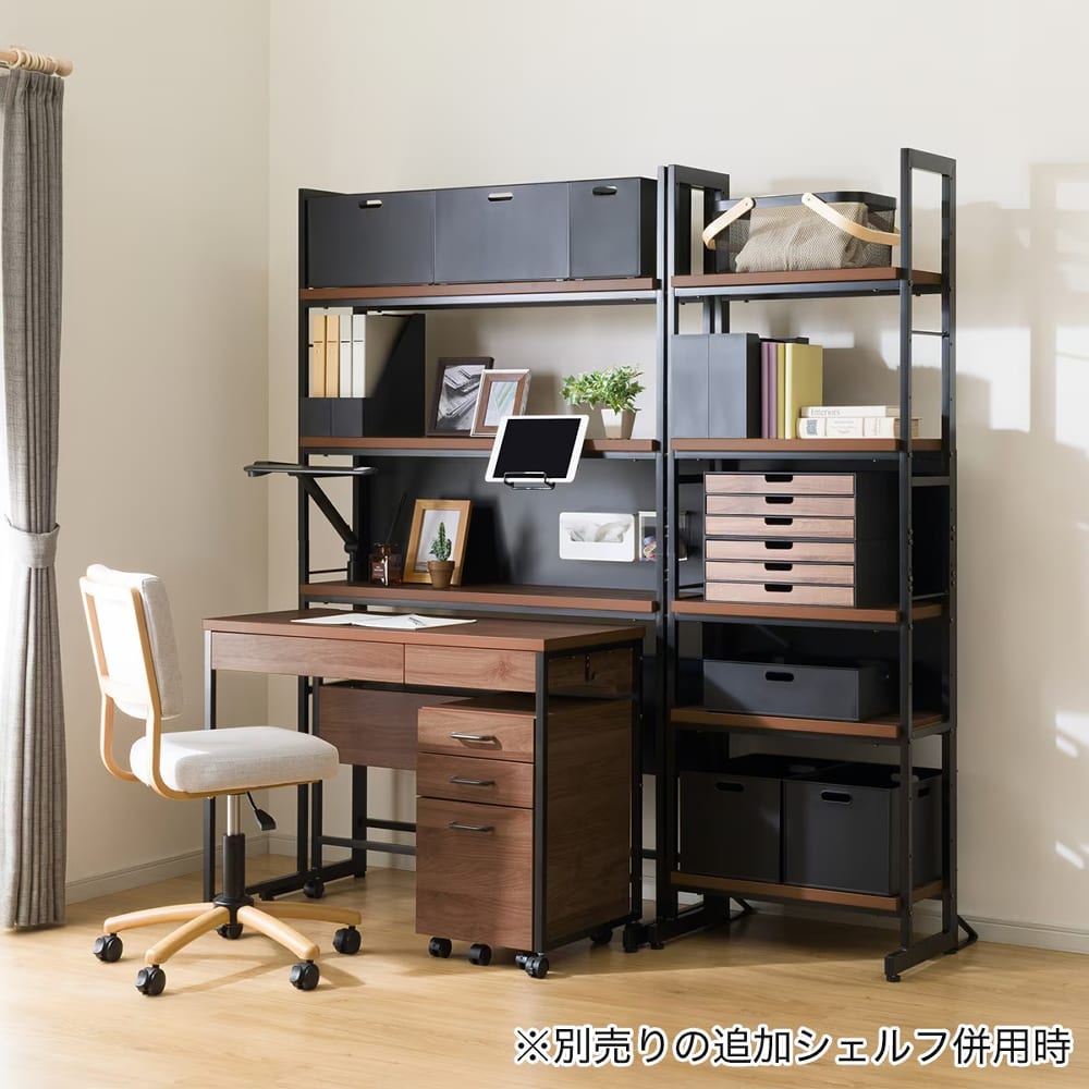 ◆開放型シェルフはデスクと自由に組み合わせることができ、L字型レイアウトやデスクの収納など、使い方に合わせてアレンジ可能です。