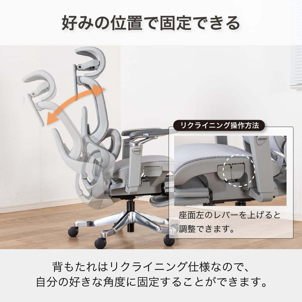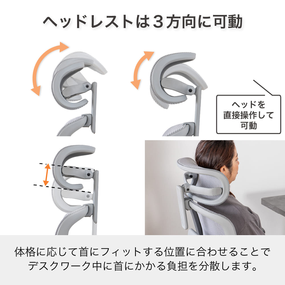 ◆高さと角度が調整できるヘッドレスト上下や傾きの調整ができ、首の負担を軽減します。