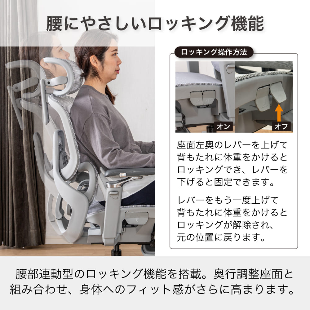 腰部連動型ロッキングで、フィット感を高めます。