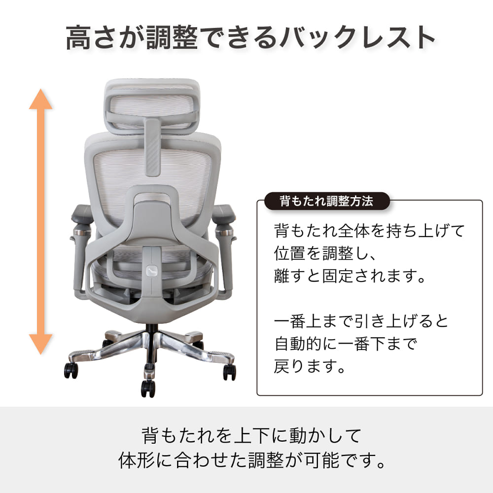 背もたれを上下に動かし、体形に合わせて調整できます。