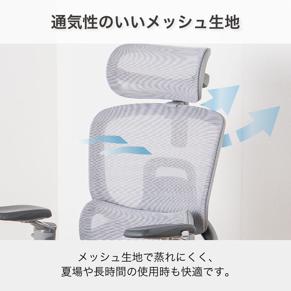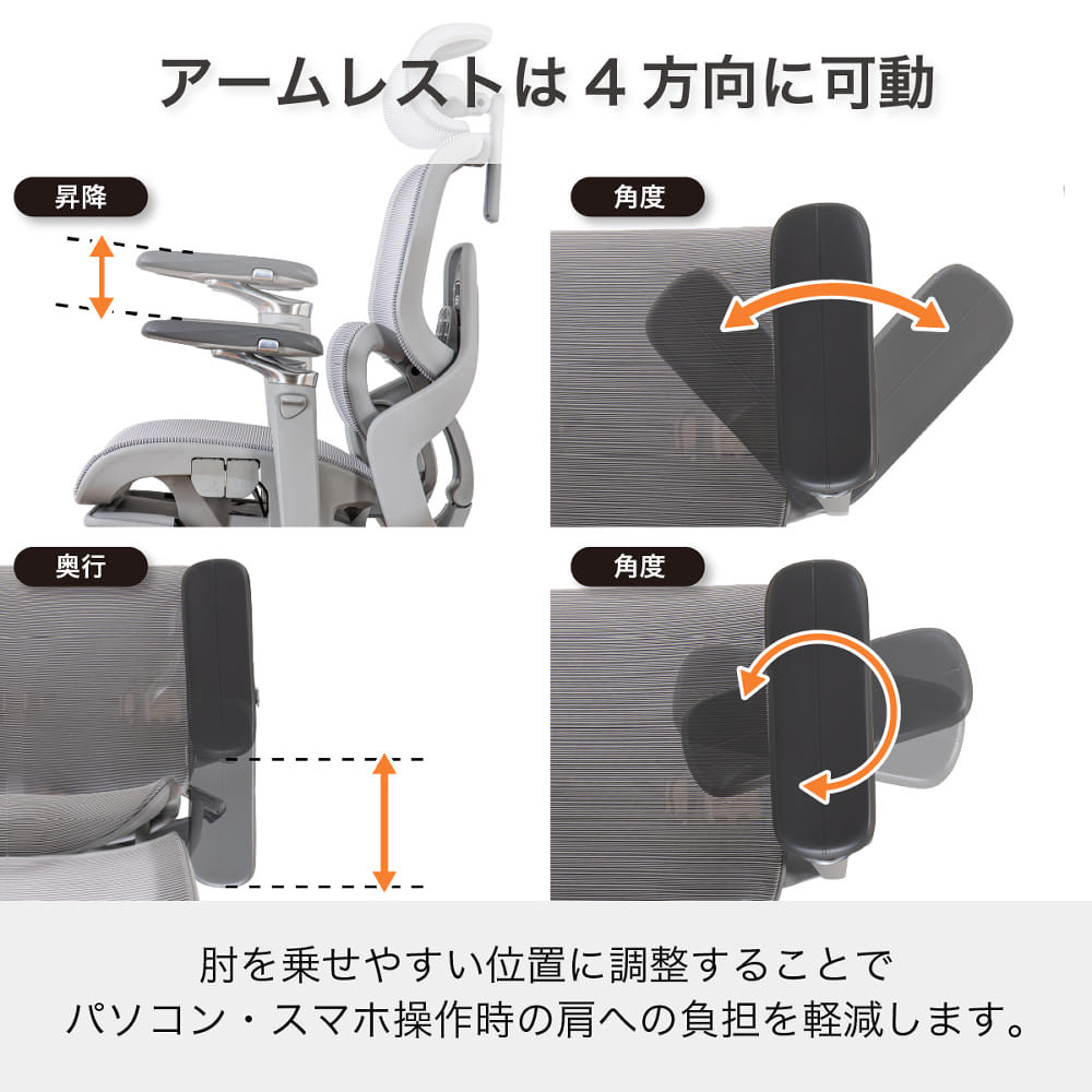上下・前後・左右の調整ができ、腕や肩への負担を和らげます。
