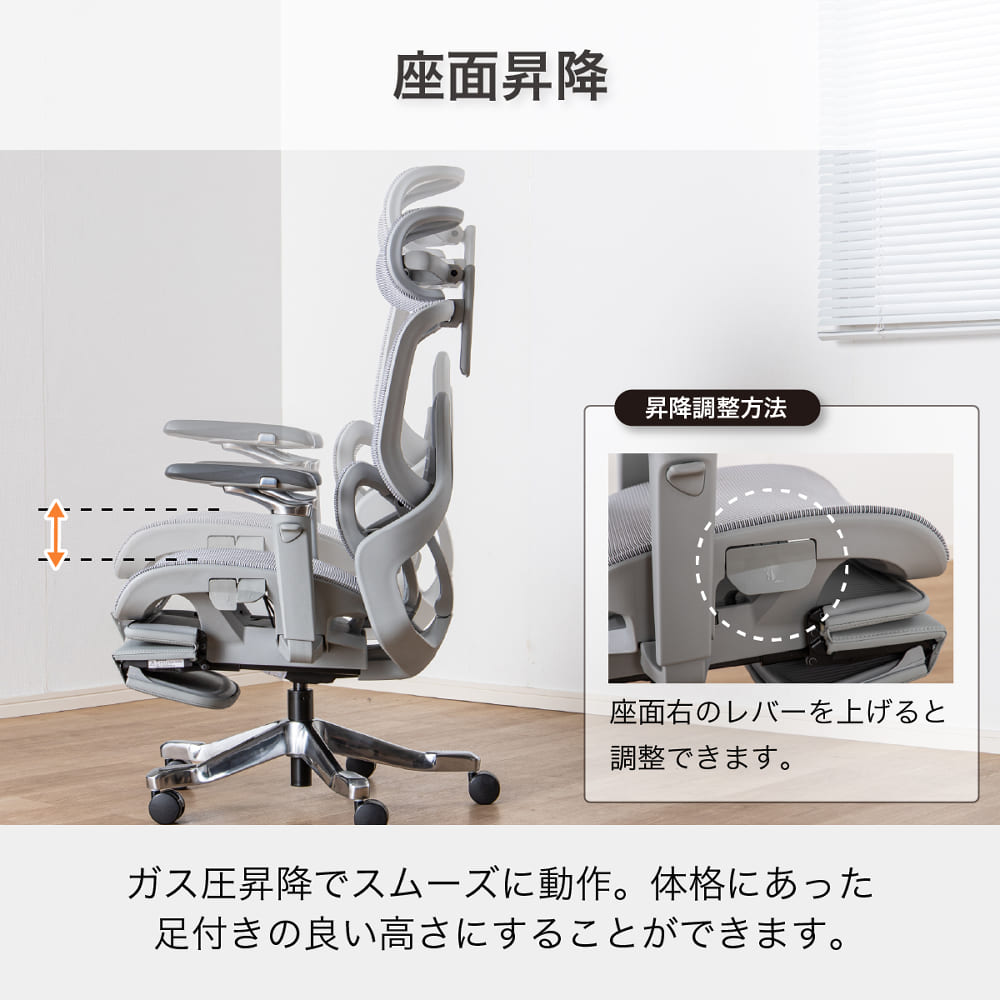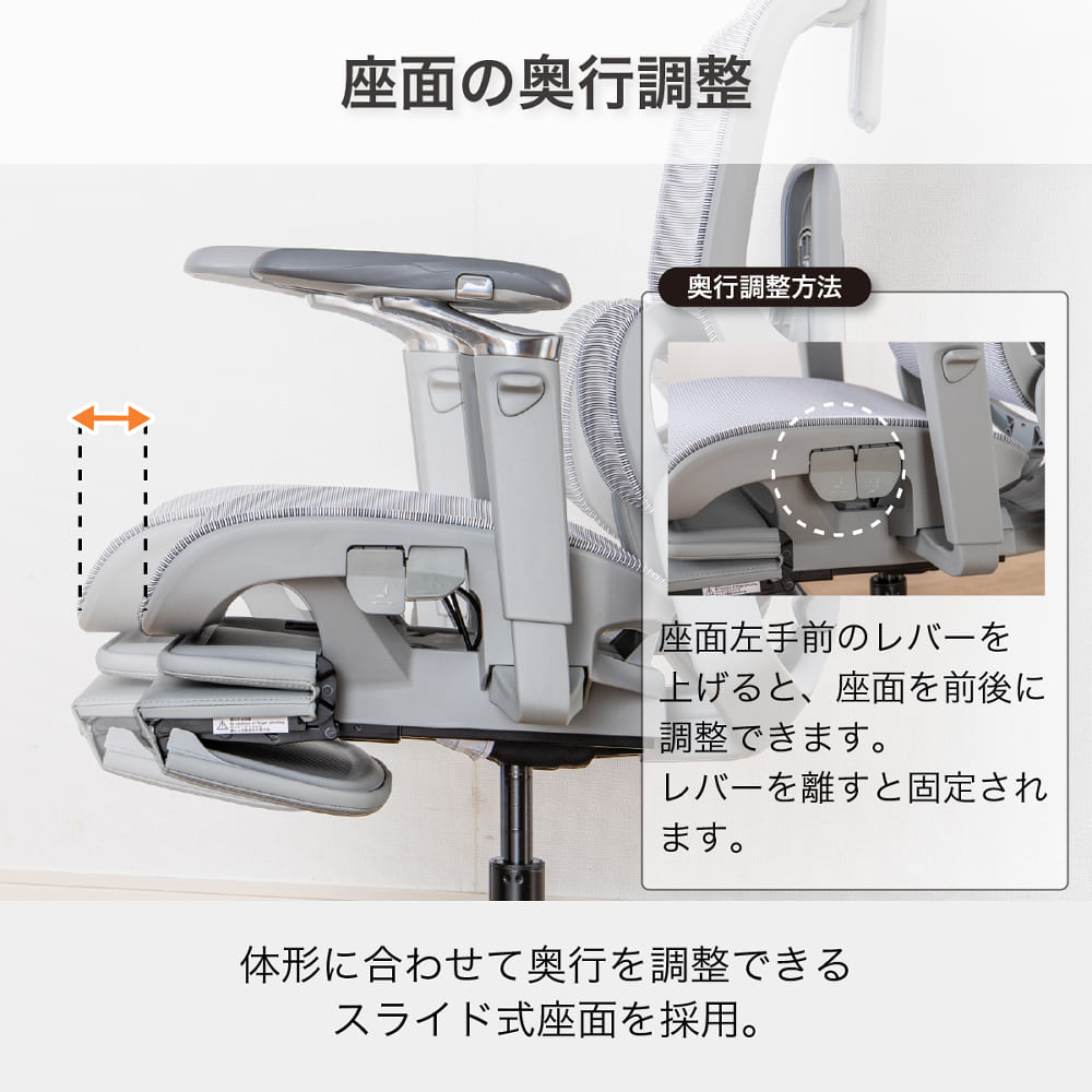 座面をスライドさせて、体形に合わせた奥行調整が可能です。