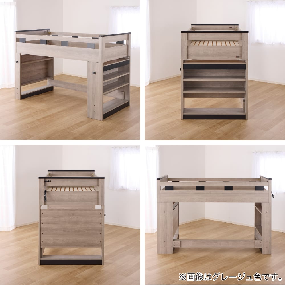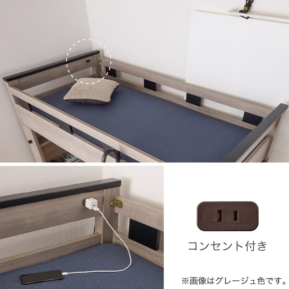 ◆【ベッドフレーム】1口コンセント付、ベッドを下ろしてシングルベッドとして使用できます。シングルベッドとして使用時は床面高2段階調整可能。(柵取り外し可)