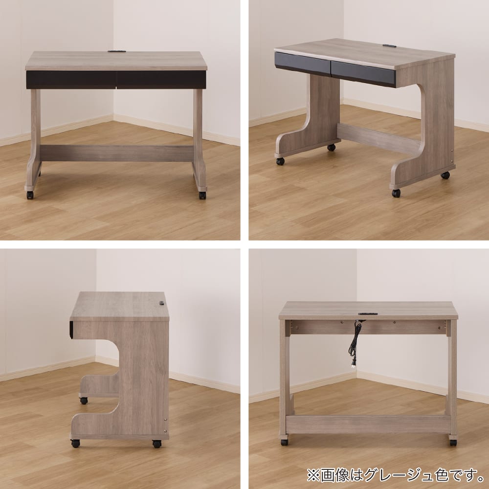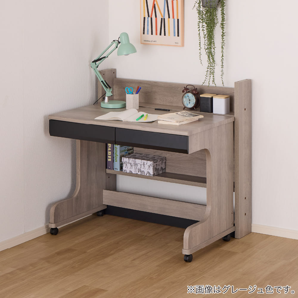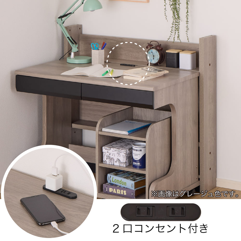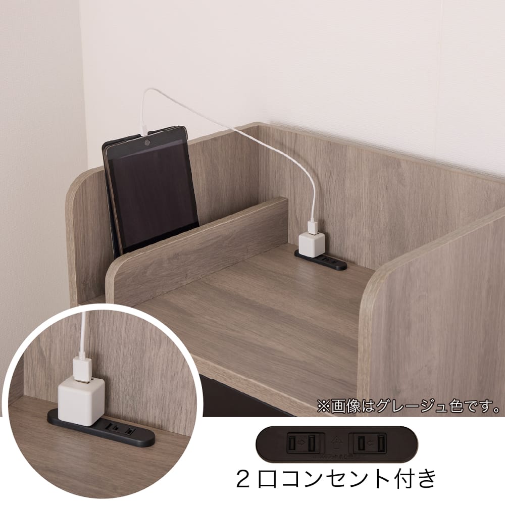 ◆【デスク】埃などが入らないスライドカバー付2口コンセント、スライドレール式の引出し付です。(ミドルシステムベッド用はストッパー付のキャスター付)