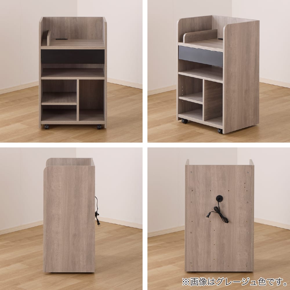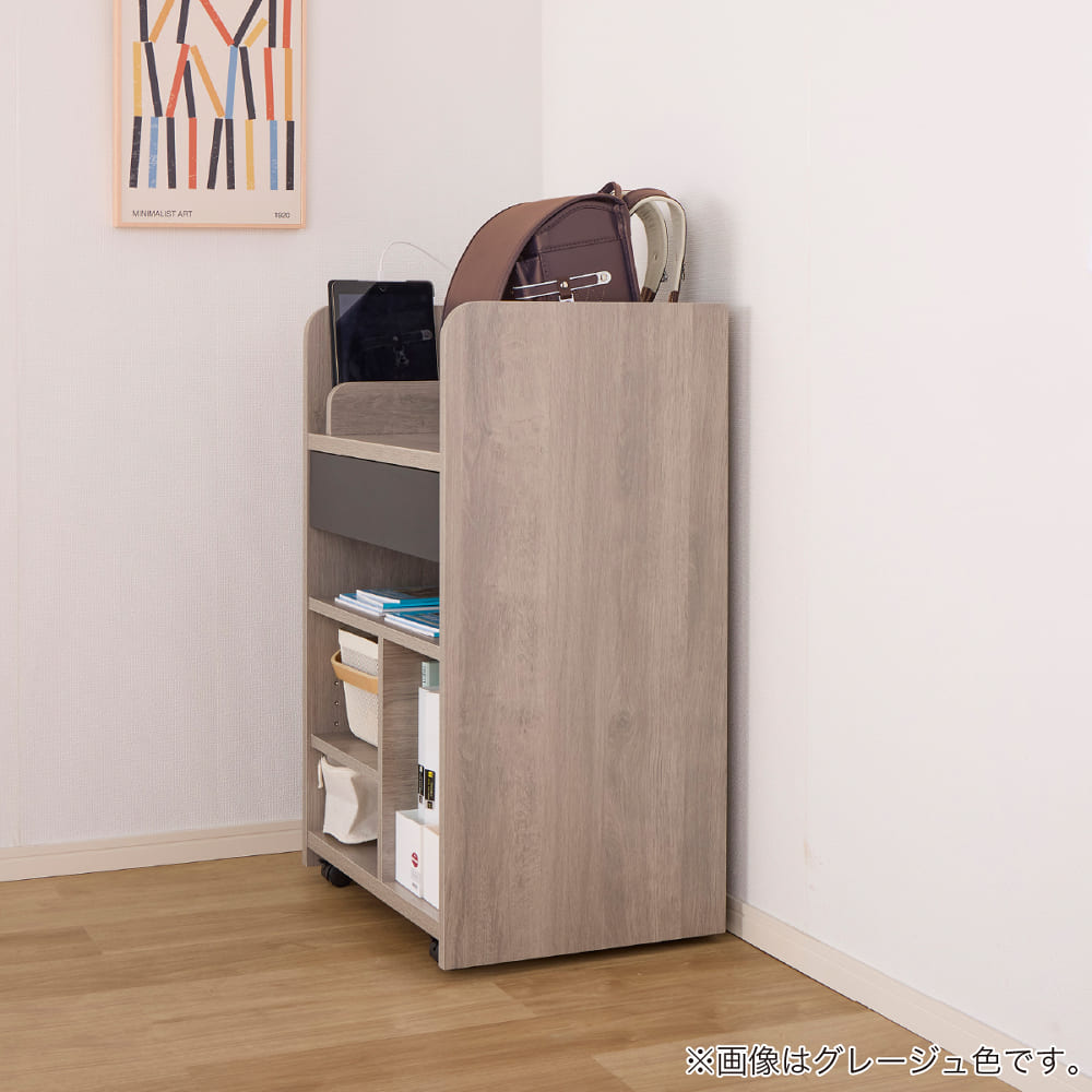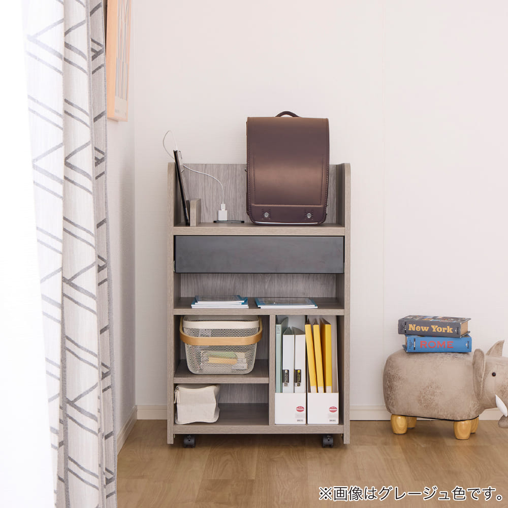 ◆【ランドセルラック】スライドカバー付2口コンセント、タブレット立て、スライドレール式の引出し付きです。キャスター付き(ストッパー付は前側2箇所)