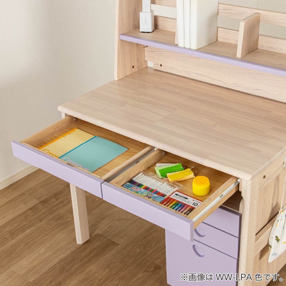 ◆無垢の天然木を生かした、木の温かみとやさしさを感じるデザインとなっています。◆デスク本体の引き出しは、A3サイズが収納できて、広い奥行で大きなものもたっぷり収納ができます。