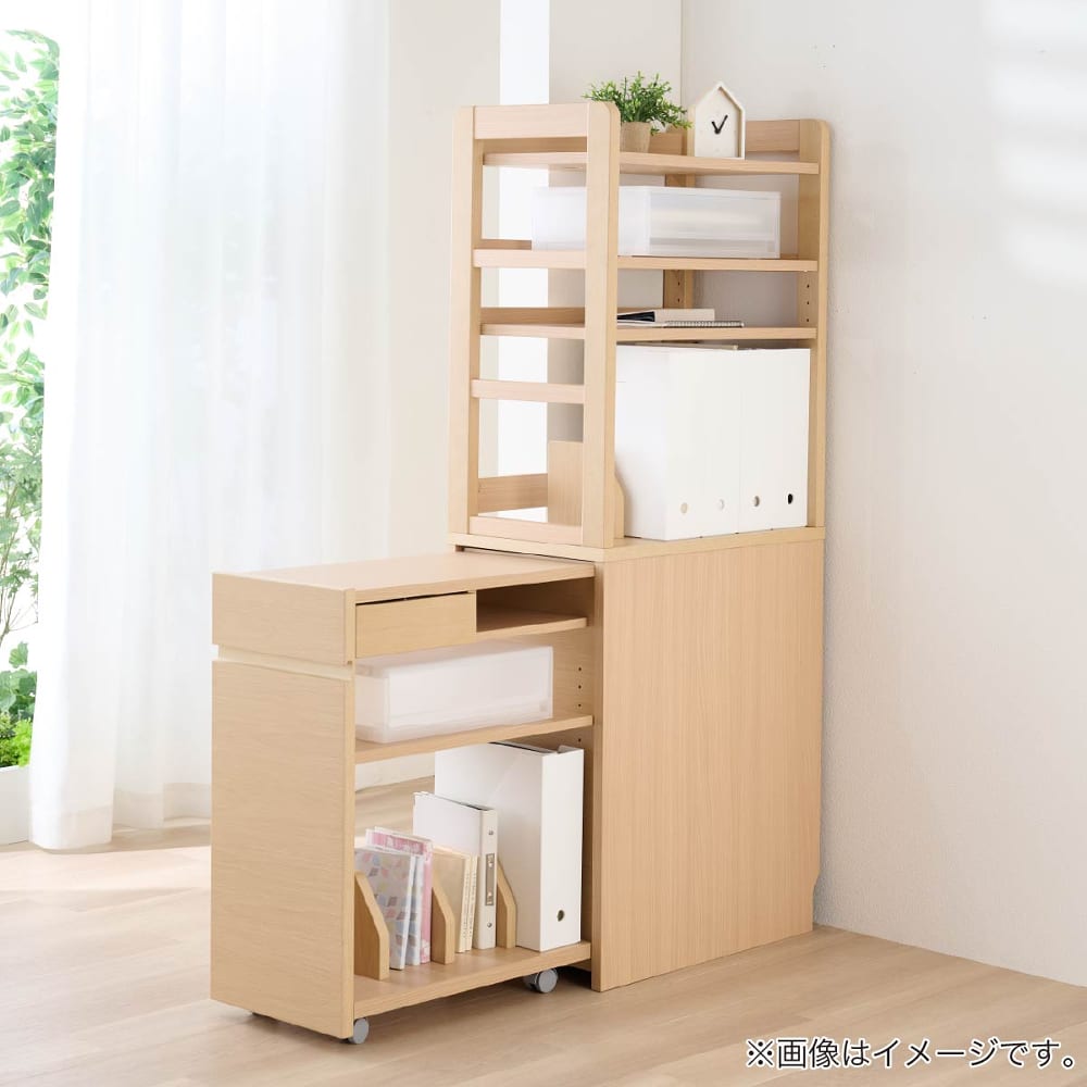◆スライドシェルフ上台の可動棚は電動デスクに合わせやすいように3pピッチで高さ調節が可能◆スライドシェルフのワゴン部は引き出して、独立して使用できます