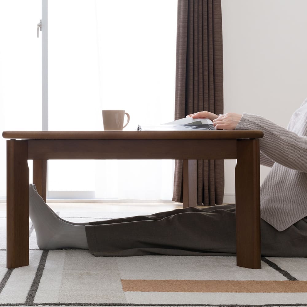 ◆天板が固定できるので、こたつを使用しない春夏シーズンも、一年中お使いいただけます。天板はピーチ突板を使用。脚は丈夫なラバー無垢材を使用しています。