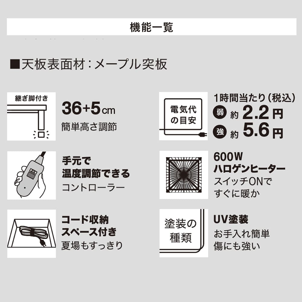 ◆ヒーターは600Wハロゲン手元コントローラー(型番MHU-601E メトロ電気工業製)◆材質:天板_メープル材突板化粧繊維板、脚_ラバーウッド材