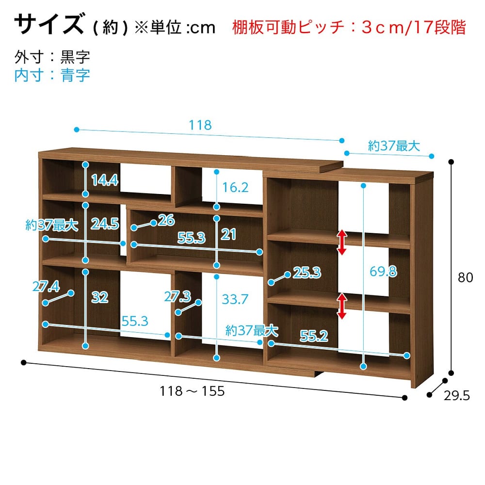 ◆幅の調節ができるので、スペースにあわせてお使いいただけます。調整幅は118cmから155cm。◆伸縮機能でスペースにぴったり&広げて収納量をアップできます。