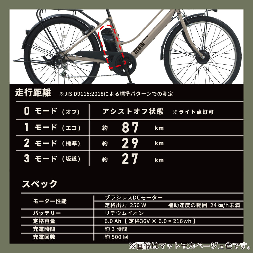 1充電あたりの走行距離の目安 エコモード:87km 標準モード:29km 坂道モード27km
