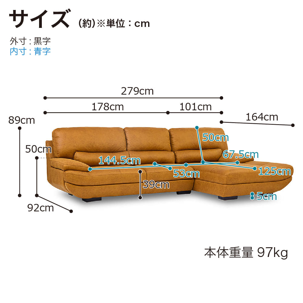 | サイズ: | 幅279cm×奥行92cm×高さ89cm(座面高39cm) |