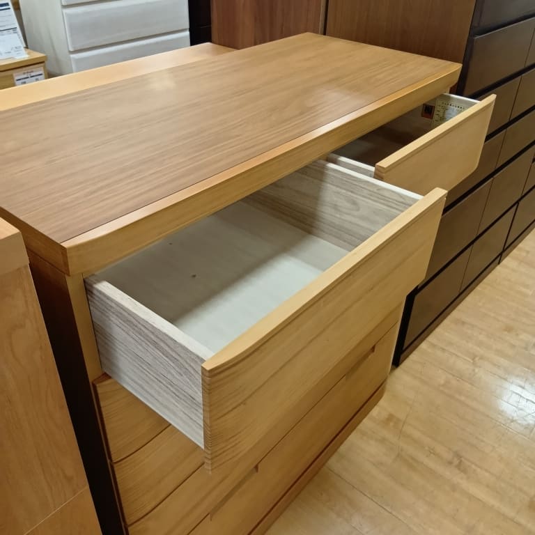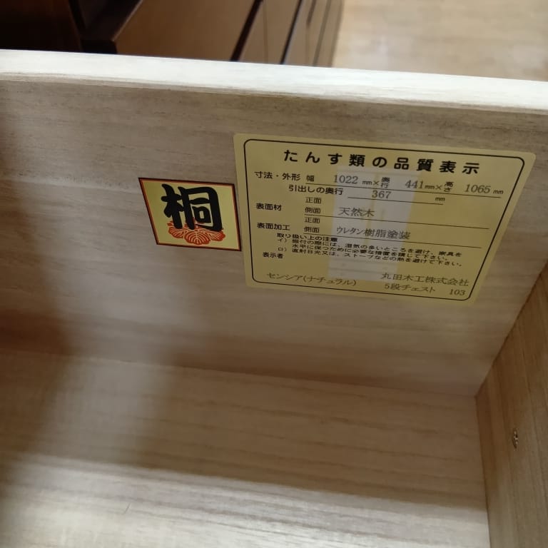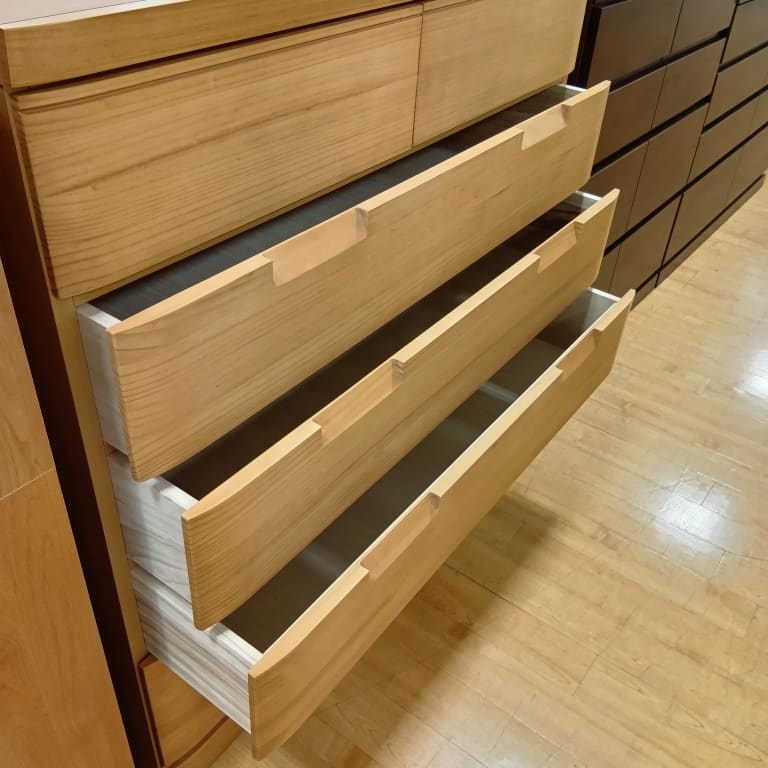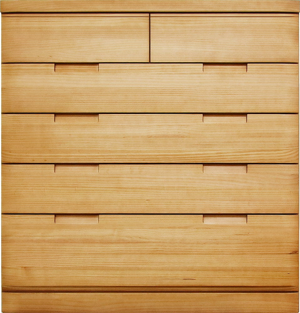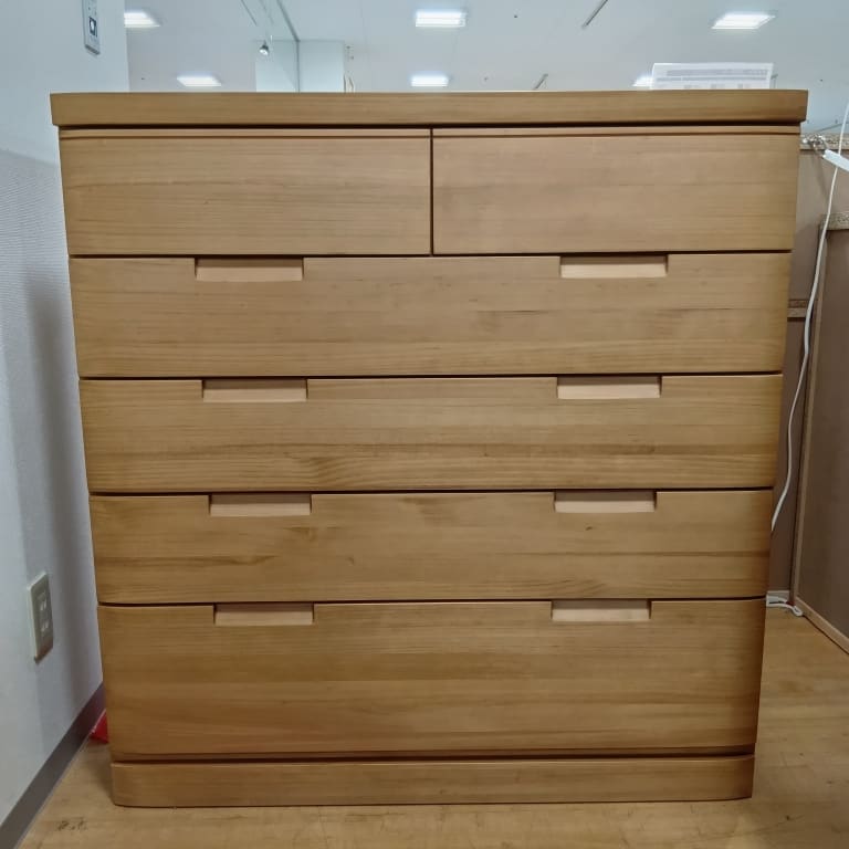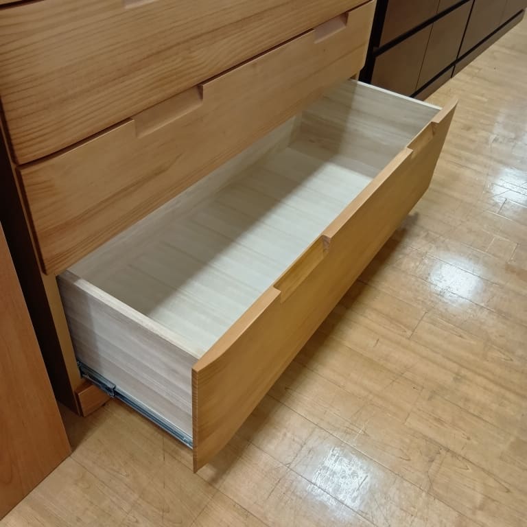 ☆こちらの商品は足立小台店の展示商品のご案内となります。展示入替品の為、特価にてご案内致します☆ 全体的に丸みのあるフォルムと、木目本来の模様が美しく見える色合いのミドルチェストです。表面材には節が少なく木目の美しさが際立つ、パイン材(ラジアータパイン)柾目が使用されています。経年による色合いの変化も魅力です。/一つ一つ、職人の方々の手によって擦り込み調整された桐箱の精度(密閉度)が、大切な衣類を湿気・埃等から保護します。/5mmの底板は両面桐柾の突板貼りが、また地板にも桐シートの化粧貼りが施され、大切な衣類を守ります。/引き出しにはスライドレールが付いており、引出全体が手前に引き出せて便利です。/石畳組み接ぎで組まれた箱の接合部は、強度だけでなく装飾性も兼ね備えています。/接着剤にはノンホルマリンのボンドが、塗料は「F★★★★認定塗料」が使用されています。/<引き出しの高さ:最上段〜4段目→約14cm、最下段→約20.5cm>★ご注文にあたってのお願い・ご了承いただきたい事★