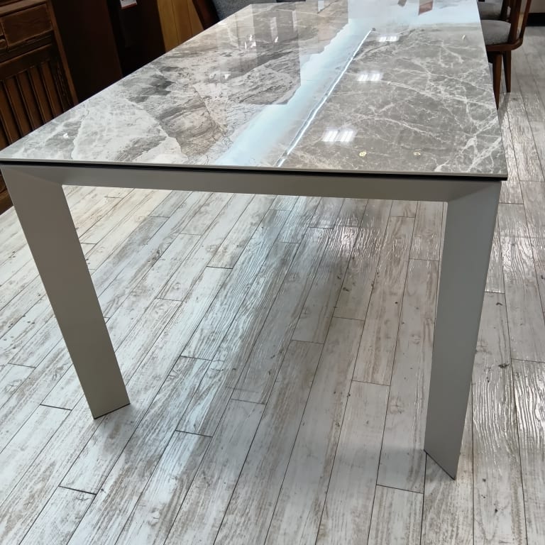 薄い直線的なフォルム・落ち着いたグレーが基調の天板と組み合わさることで、モダンな雰囲気が感じられるテーブルです。
