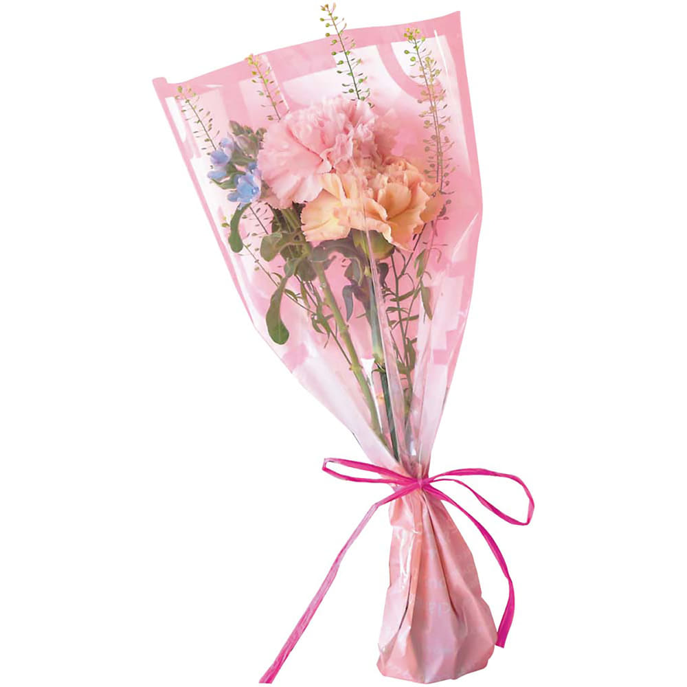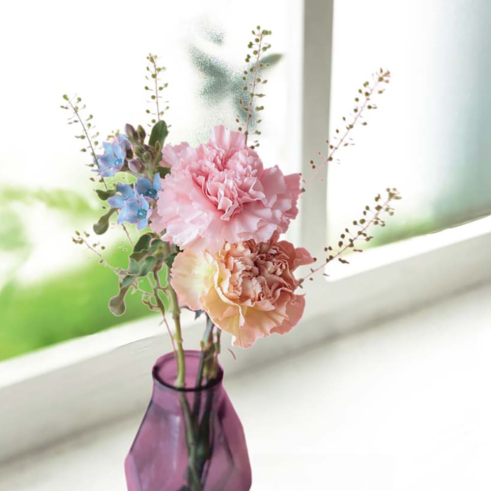 ◆パステルカラーのカーネーションと小花を合せたブーケです。◆生花(カーネーション×2・ブルースター・タラスピ)、お手入れのしおり付き