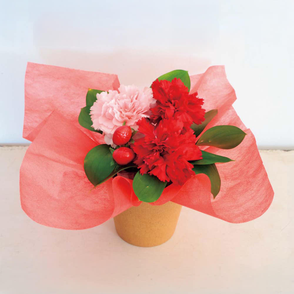 ◆定番の赤いカーネーションにイチゴの造花を合せてかわいくアレンジしました。◆生花(カーネ―ション×3・マルバルスカス)、造花(ストロベリーピック)、プラポット、お手入れのしおり付き