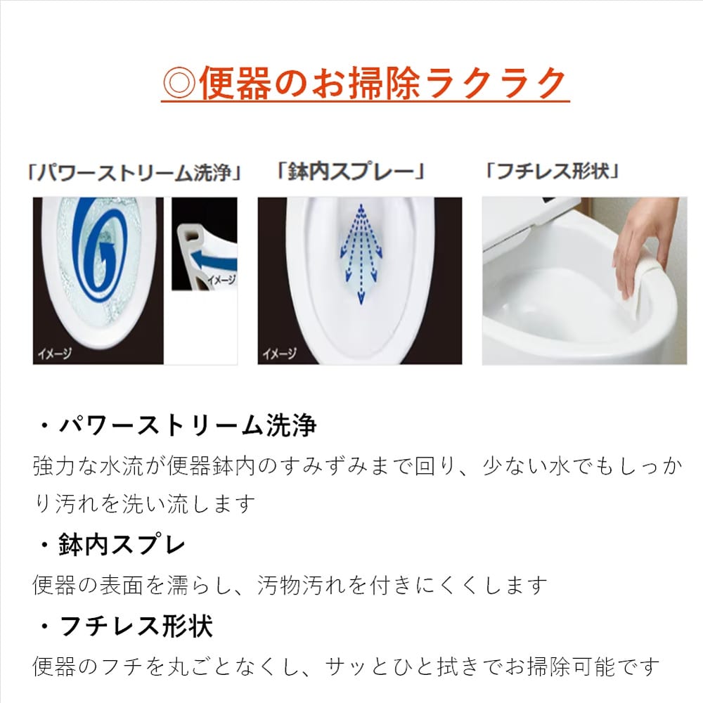 ◆パワーストリーム洗浄:強力な水流が便器鉢内のすみずみまわり、しっかり洗い流します。