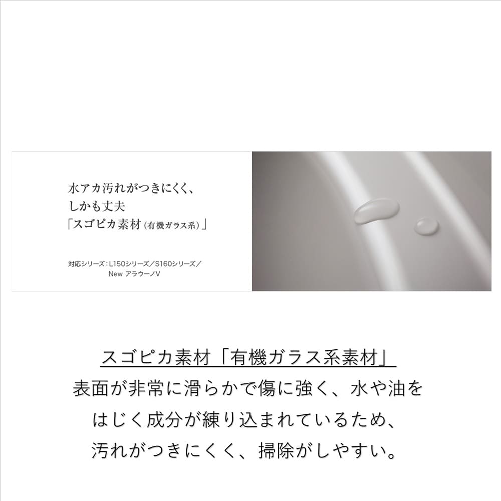 ◆スゴピカ素材(有機ガラス系):汚れにくくお掃除もラクラク。汚れの原因”水アカ”をはじきます。