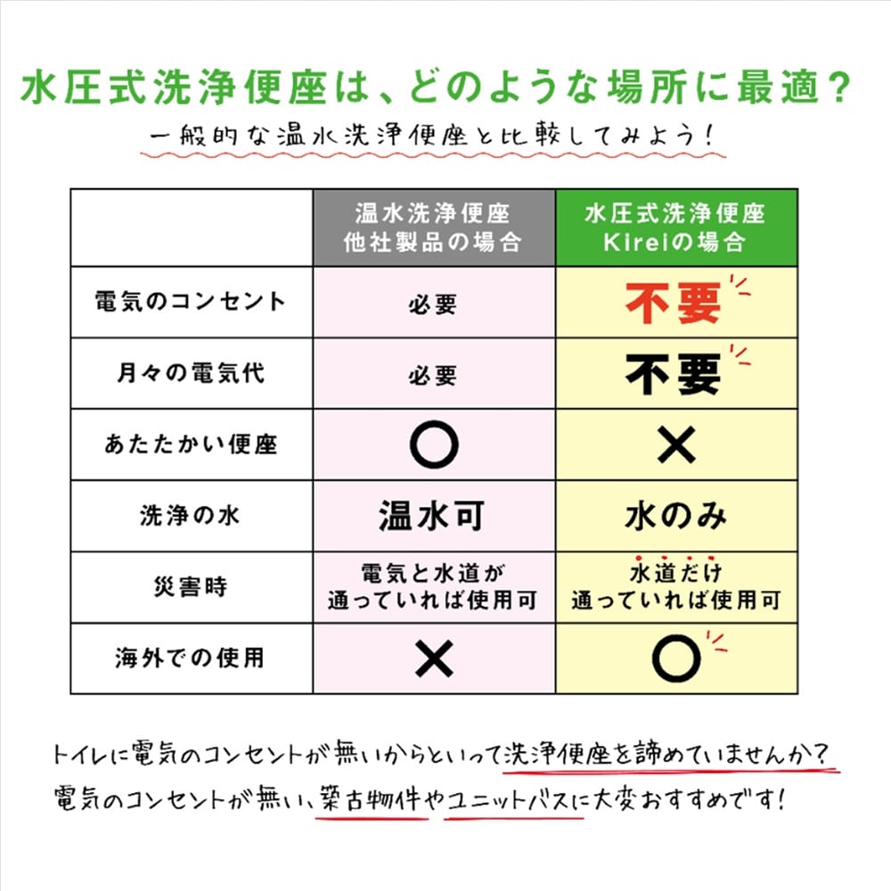 ◆ハイブリット式:電源がある時は温水・暖房便座が使え、停電時でも水圧で洗浄可能。