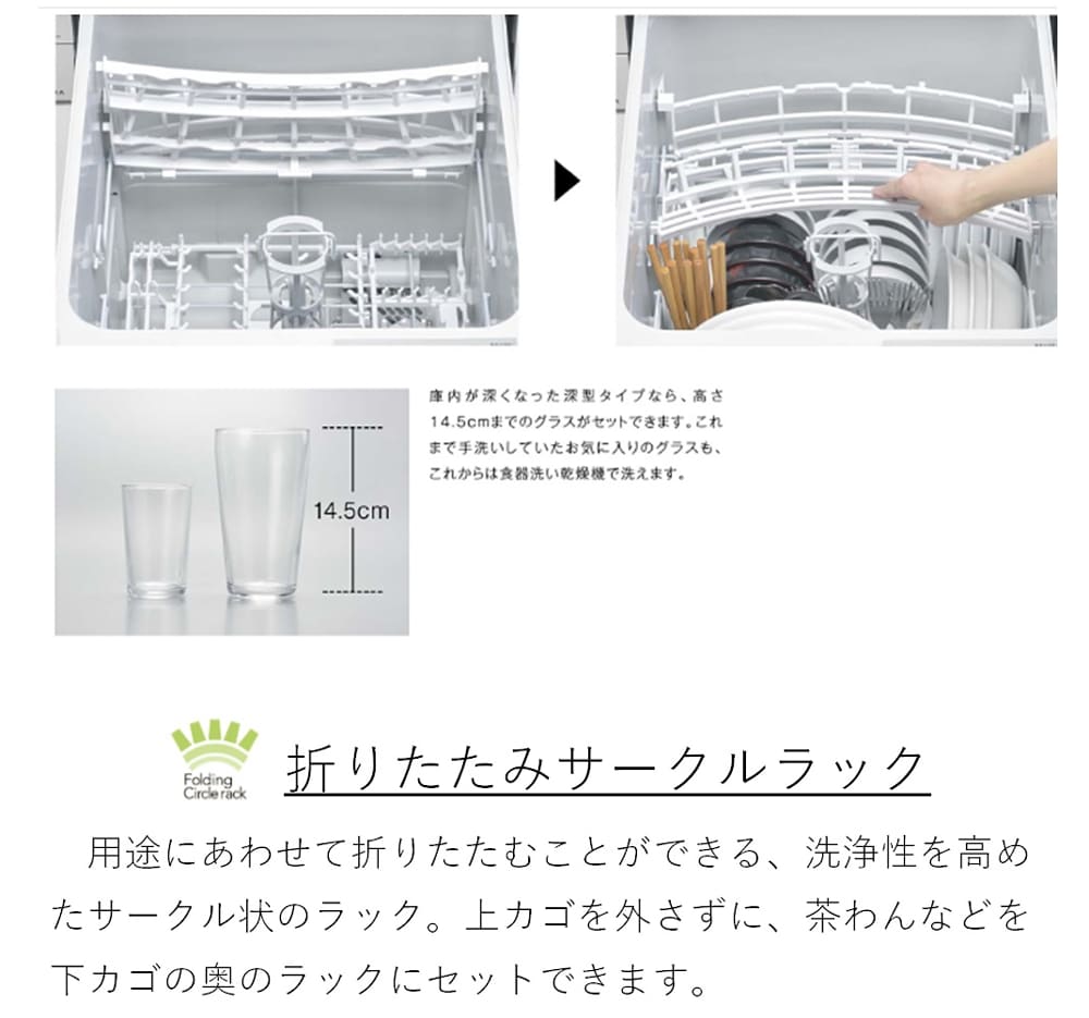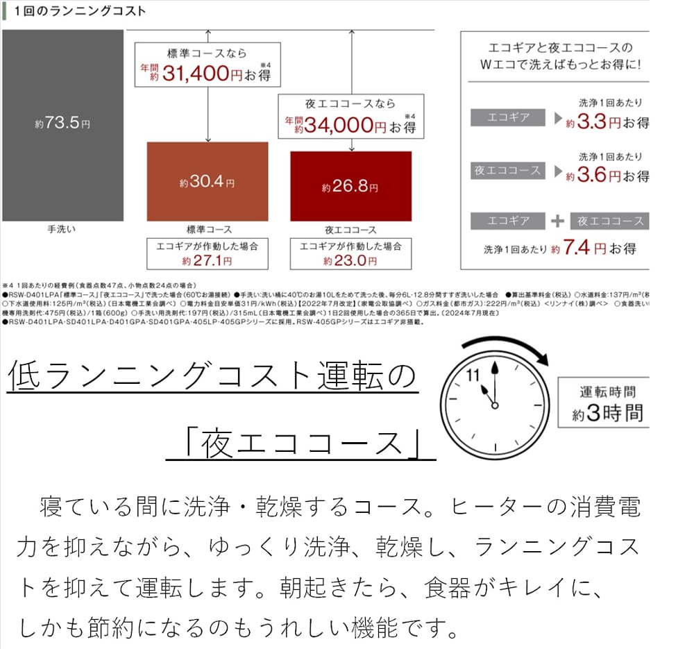 運転コース:標準、重曹、念入り、洗浄のみ、夜エコ、乾燥、クリーンキープ、庫内洗浄
