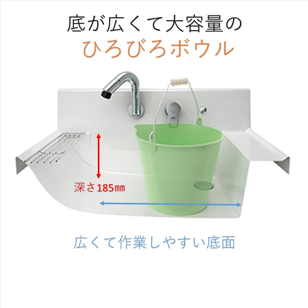 ◆ひろびろボウル:広くて作業しやすい底面。ハイバックガード一体ボウルで汚れの拭き取りも楽々。